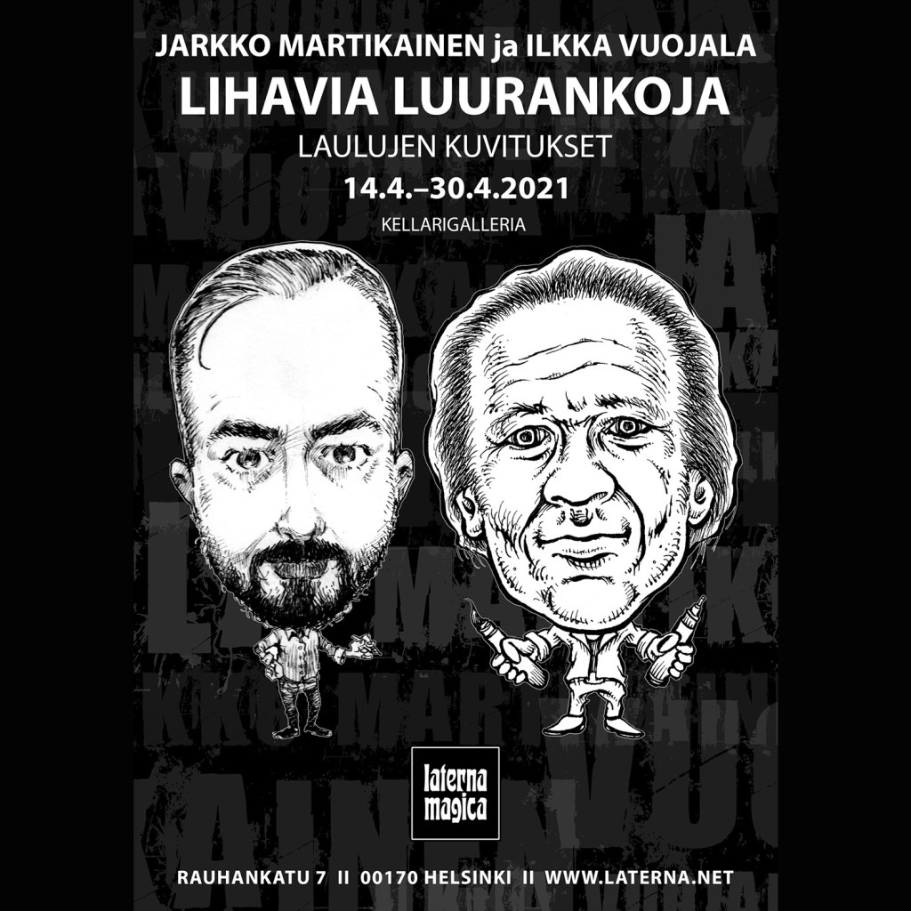 Lihavia luurankoja – Laulujen kuvitukset (yhteisnäyttely Jarkko Martikaisen kanssa), Laterna Magica, Helsinki 14.4.-30.4.2021